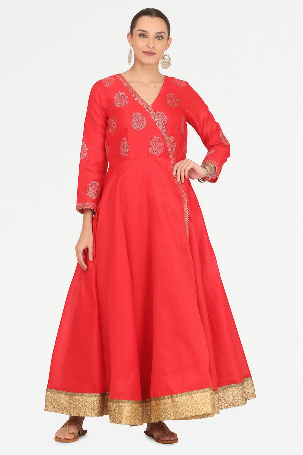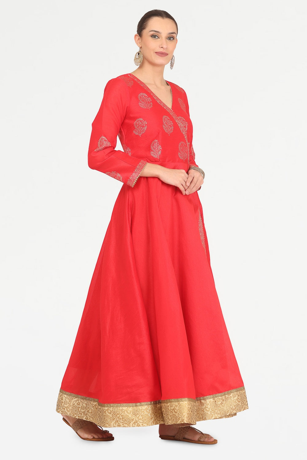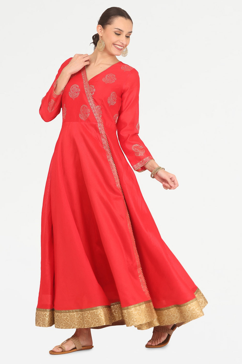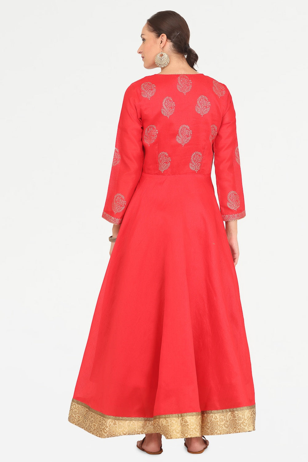 Vibrant red silk anarkali with block print design.