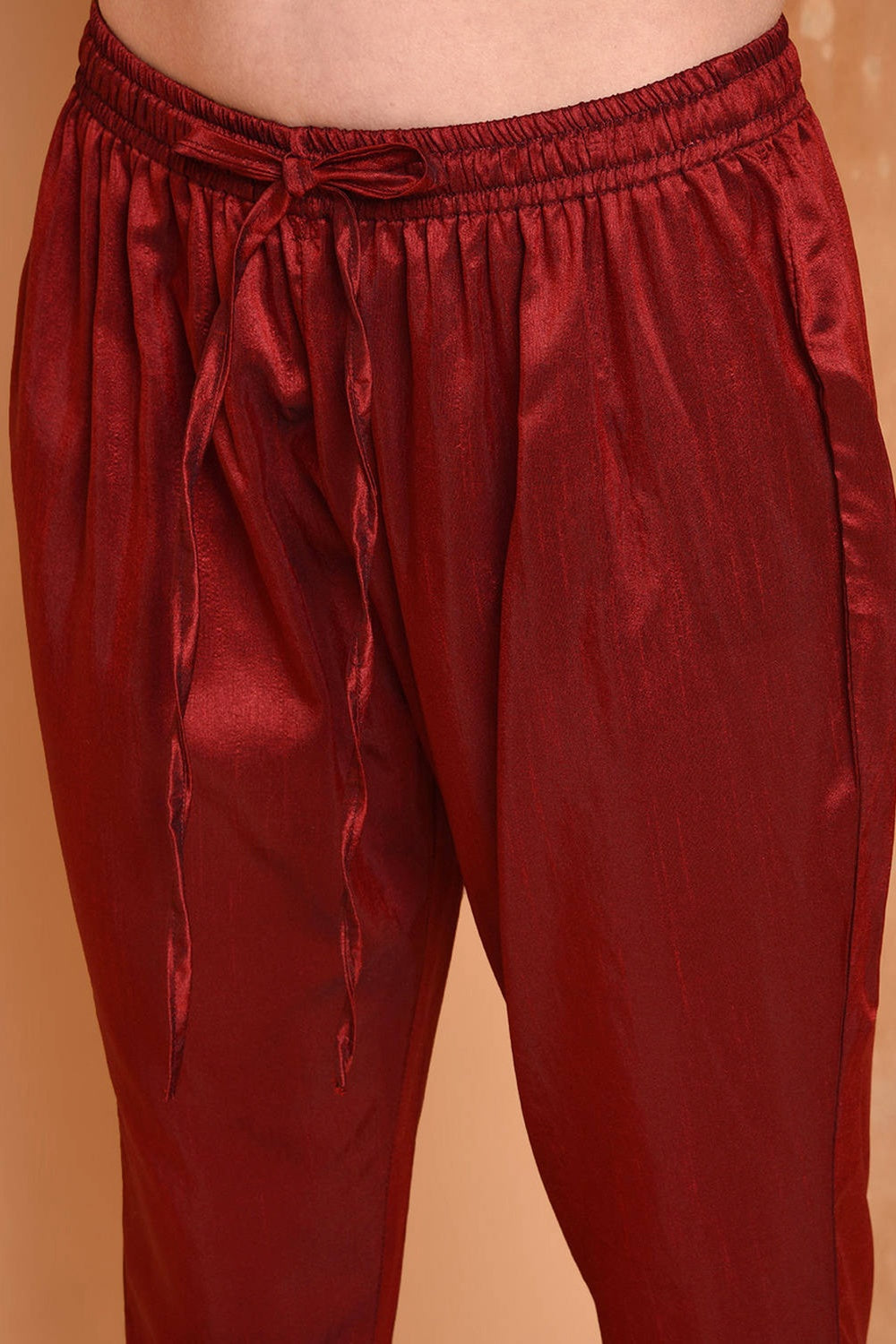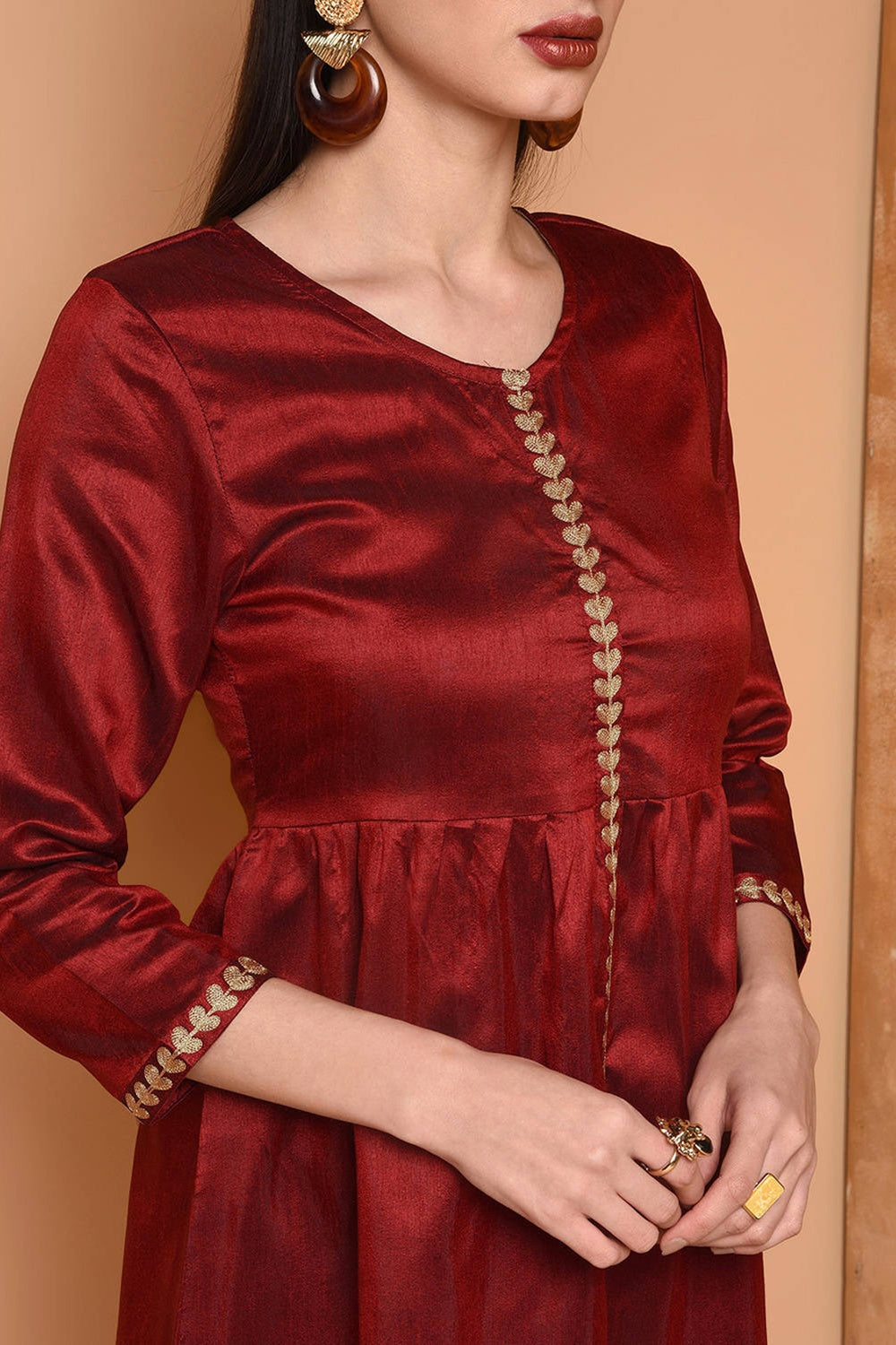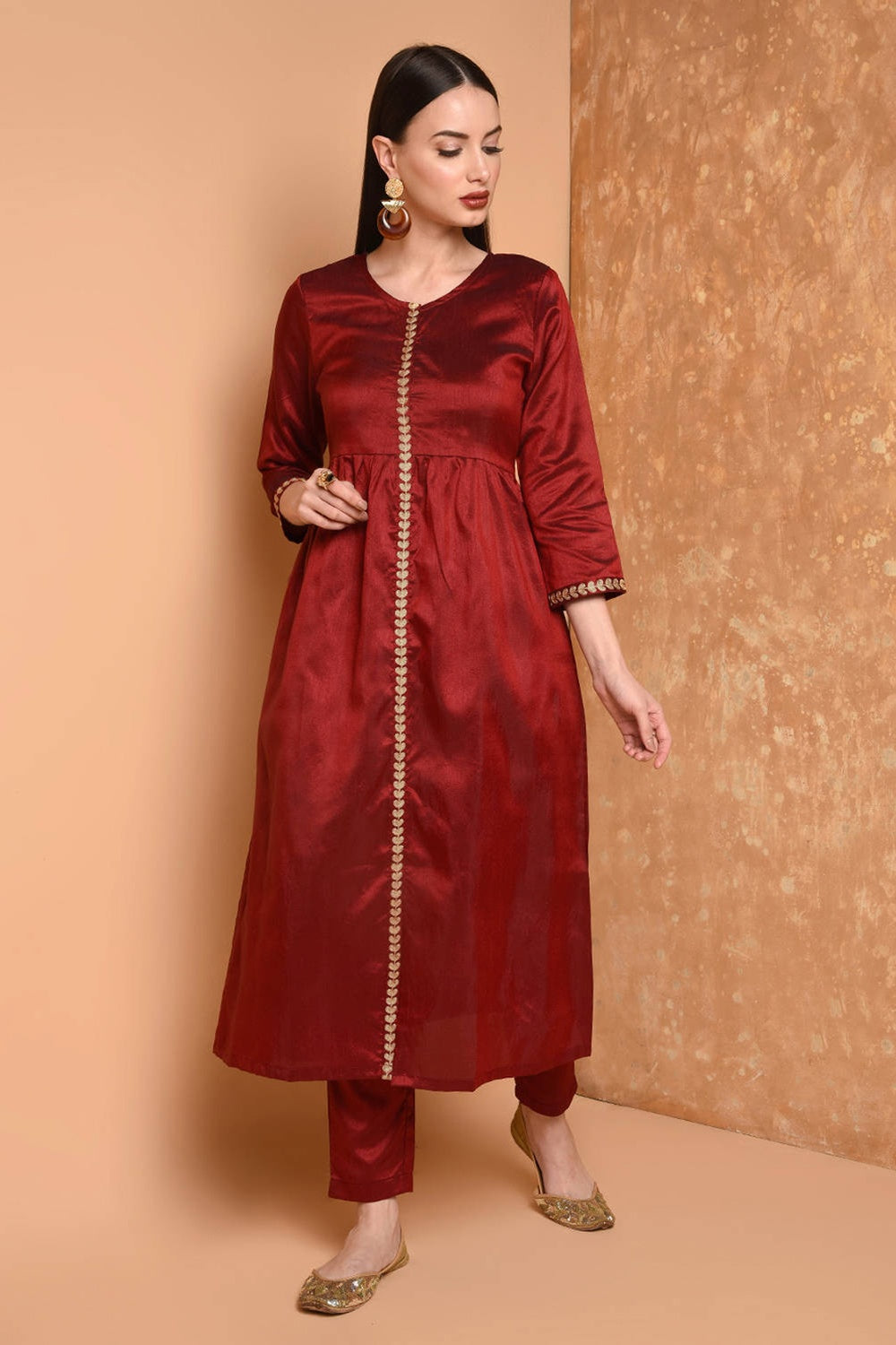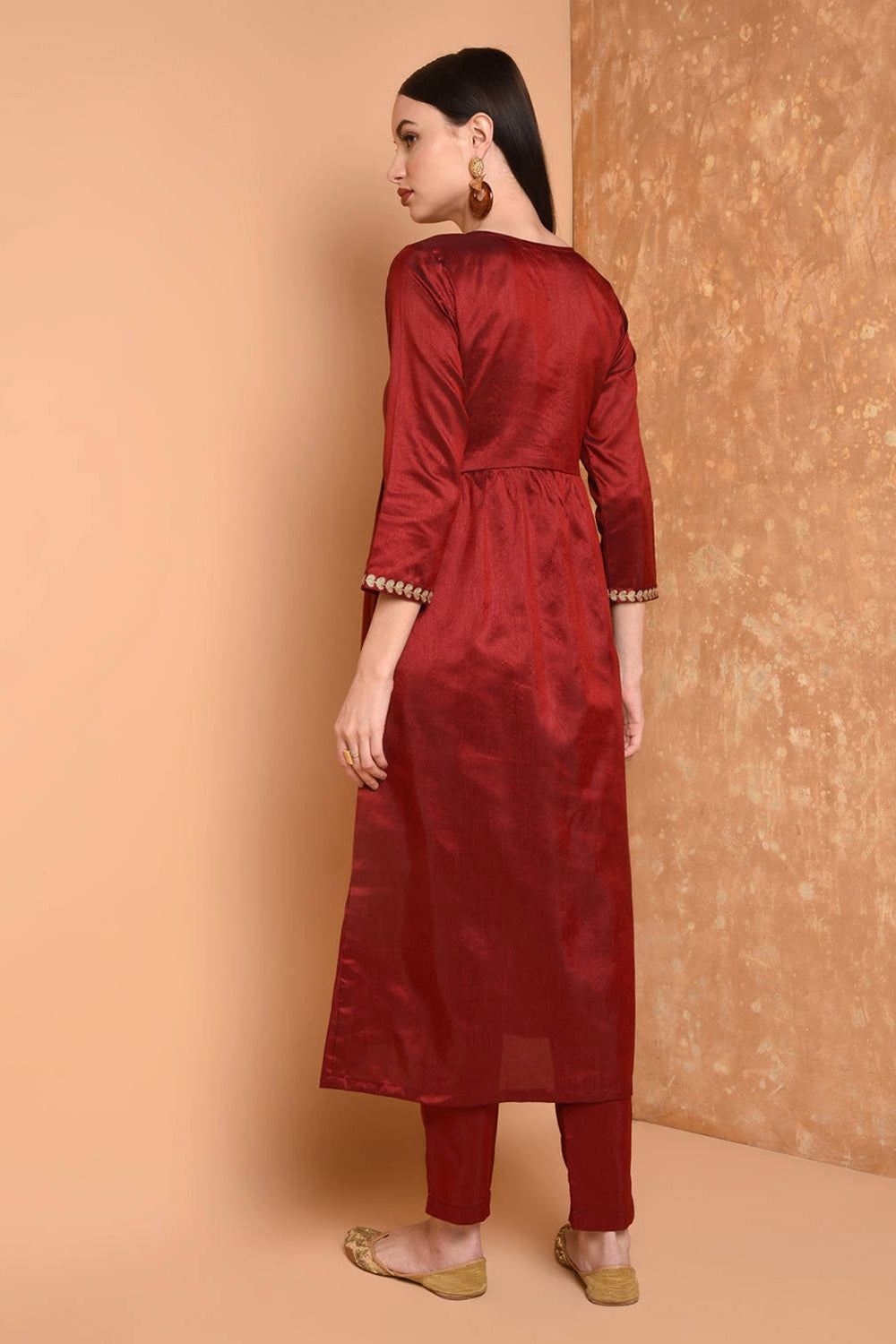 Rich maroon silk kurta set with intricate embroidery.