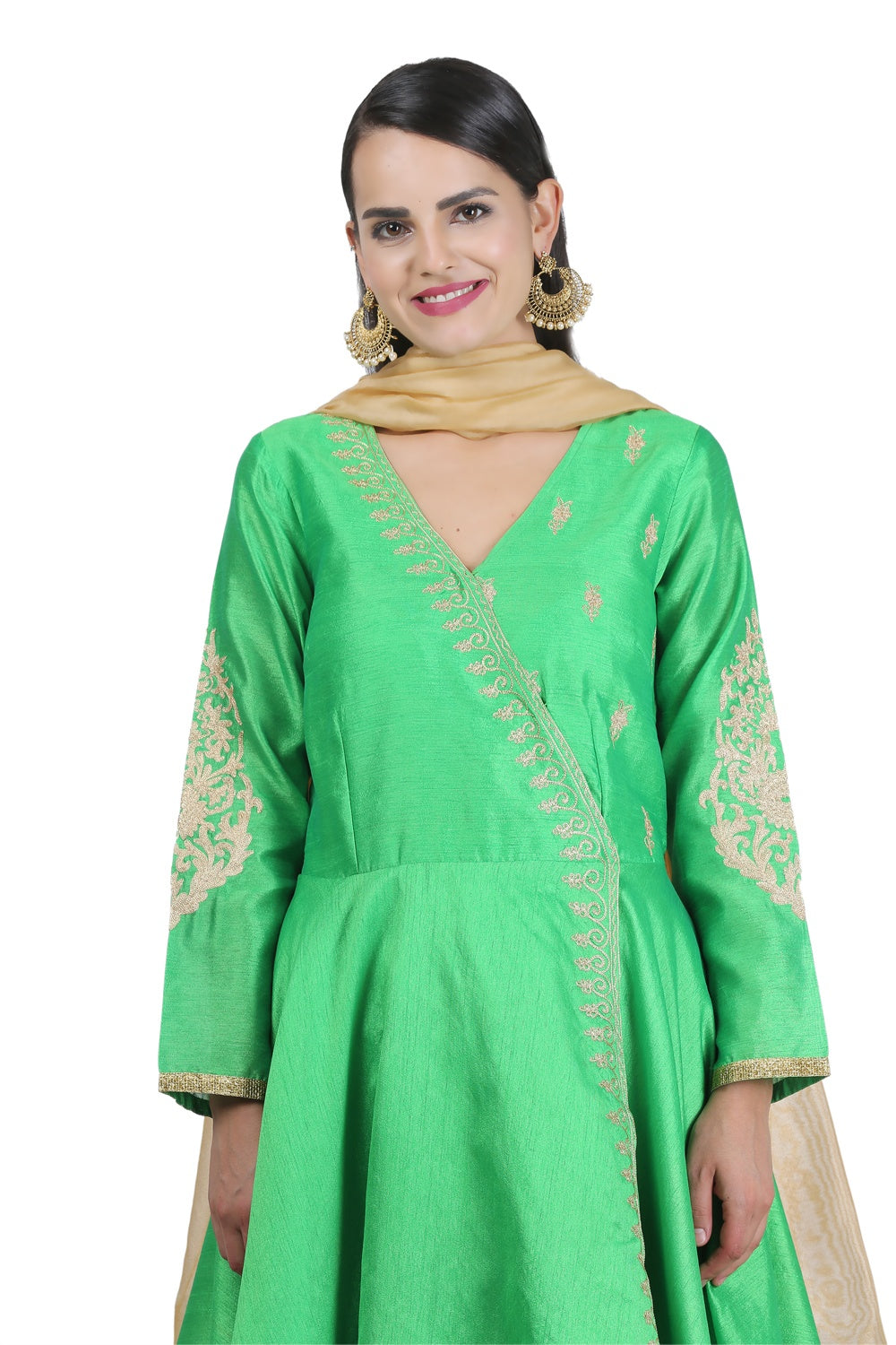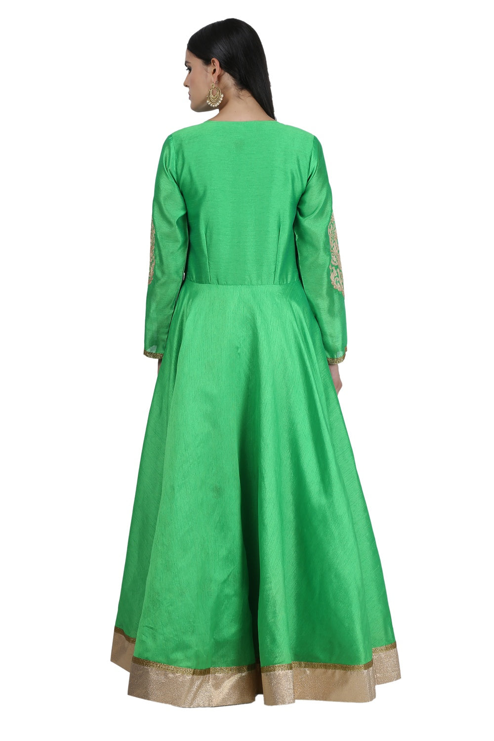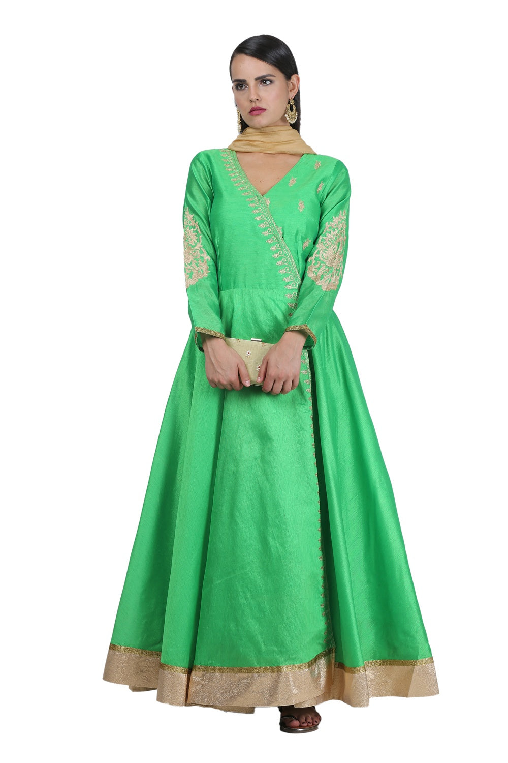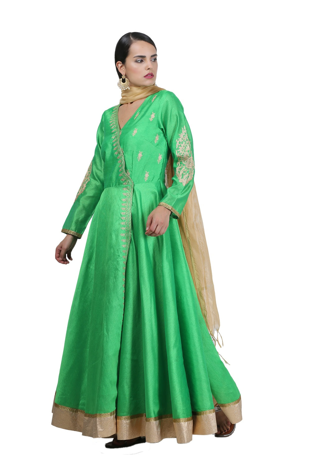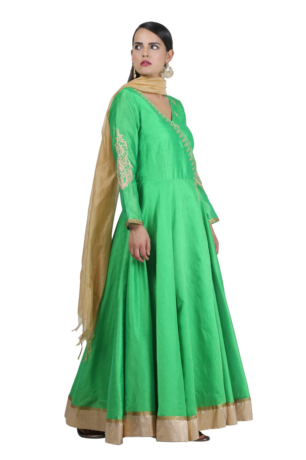 Beautiful green silk anarkali with embroidery on the top and beige accents. perfect for weddings and parties.
