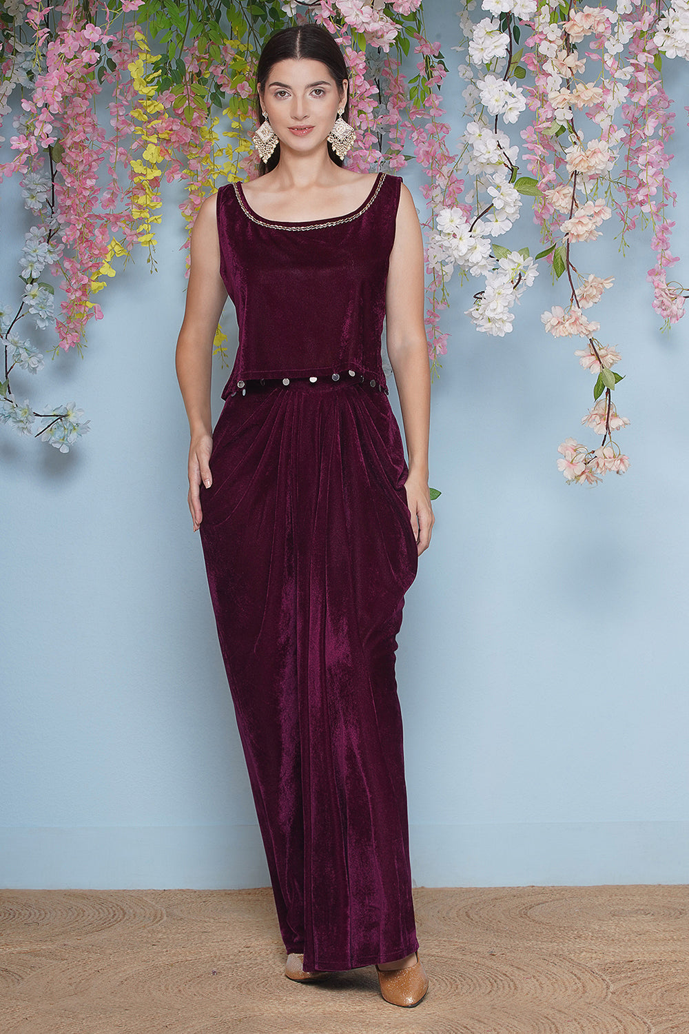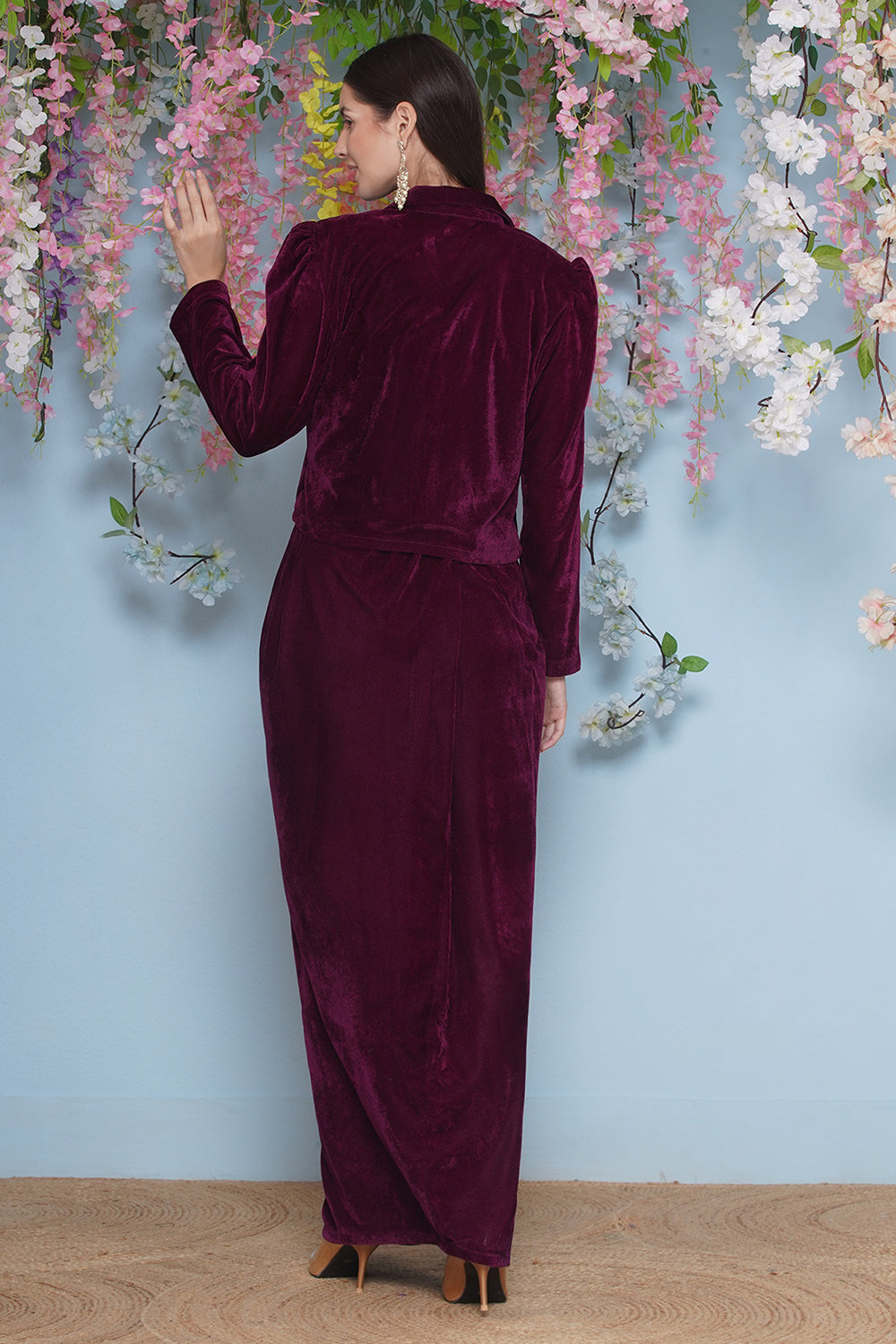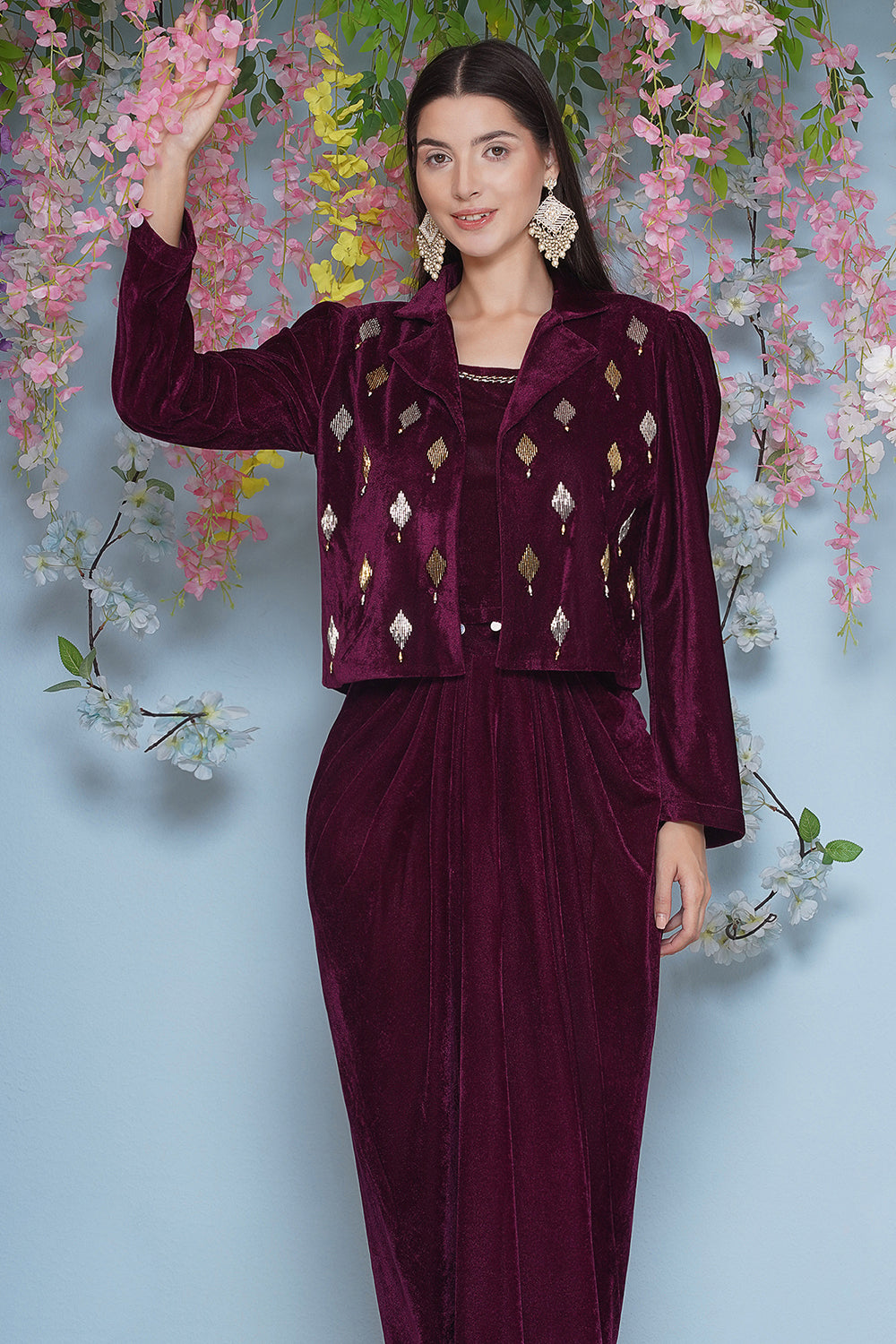 Wine Hand Embellished Jacket with inner and skirt